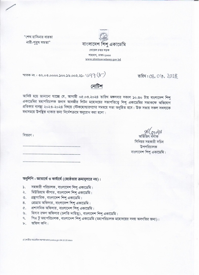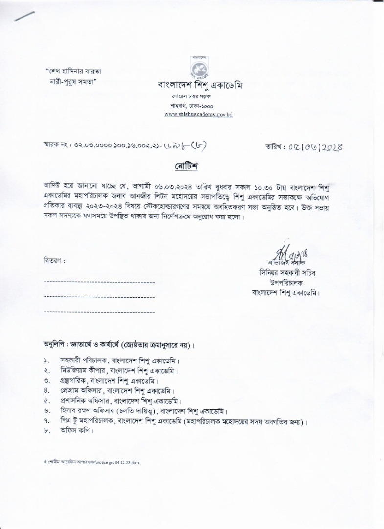 | অভিযোগ প্রতিকার ব্যবস্থাপনা ২০২৩-২০২৪ বিষয়ে স্টেকহোল্ডারগণের সম্বনয়ে সভা। | ০৪-০৩-২০২৪ | |